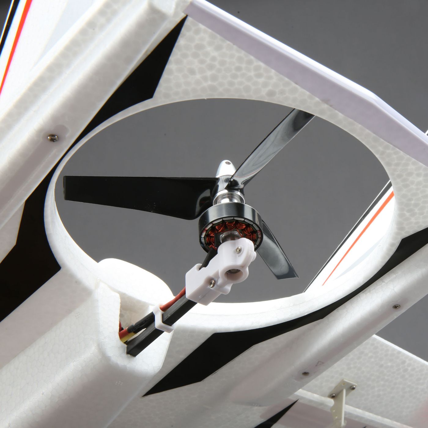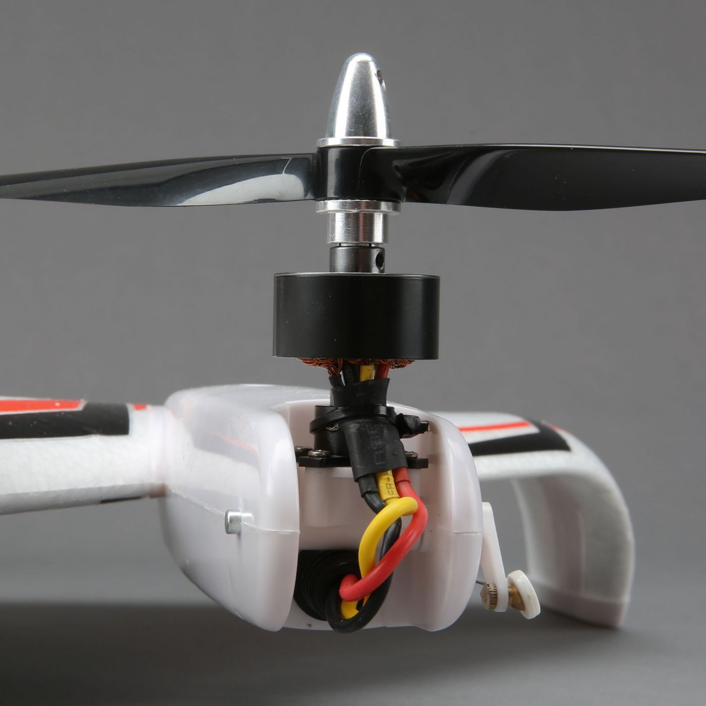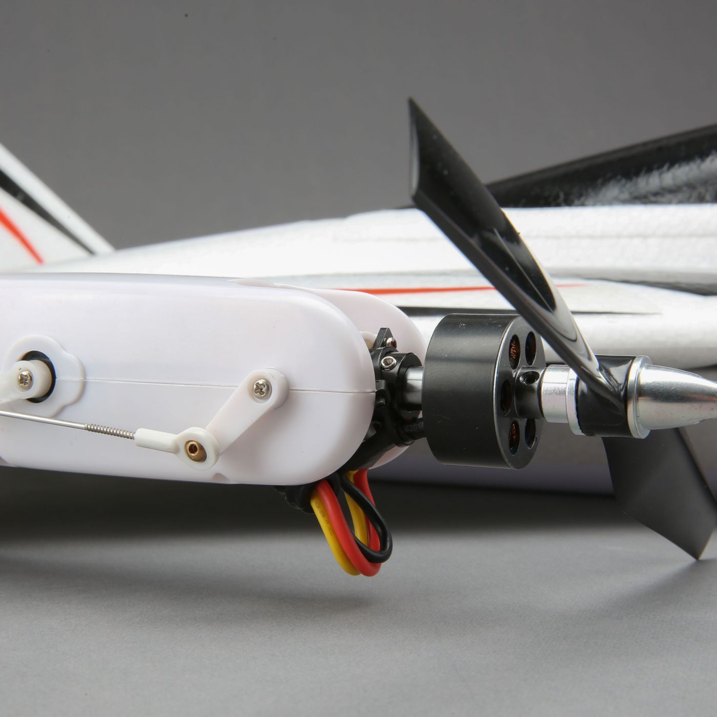 Unlike complex VTOL aircraft that rotate the entire wing and require as many as four motors to achieve vertical and forward flight, the Convergence® park flyer uses a simple, yet sleek, delta-wing design with three brushless motors - two rotating motors on the wing and a fixed-position motor in the tail.