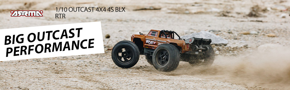 The OUTCAST⢠4X4 4S BLX joins the ARRMAŽ brushless lineup as the perfect middle ground between 3S BLX vehicles and all-out 6S BLX machines. It delivers affordable, no-holds-barred stunt performance for brushed bashers looking to upgrade and anyone who wants ARRMAŽ toughness and 50+ mph speed!