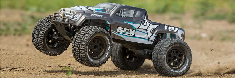 Designed to dominate the terrain, drive wilder and destroy the competition, the Brushless ECXŽ RuckusŽ Monster Truck demands respect. This unrelenting beast doesn't flinch even in the harshest conditions due to waterproof electronics, tough chassis, and well-known ECX durability. The Ruckus is well-equipped to lead the charge in the driveway or backyard with beastly features and an intimidating snarl such as Spektrum⢠STX2⢠2Ch 2.4GHz FHSS Radio System, 540 3300Kv 6-Pole Non-Sensored Brushless Motor, 7.6V 3000mAh 2S 20C LiPo Battery, and 20W LiPo AC Balance Charger (1-1.5 hour charge time). No matter if you want to attack the unknown outdoors or hit the ramp and fly, the ECX Ruckus is the basher's choice.