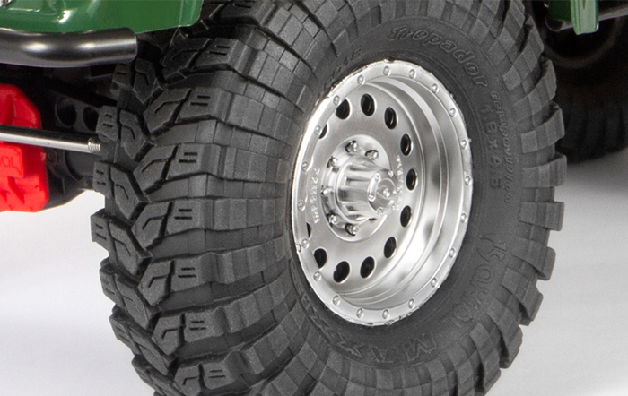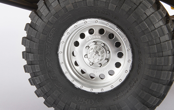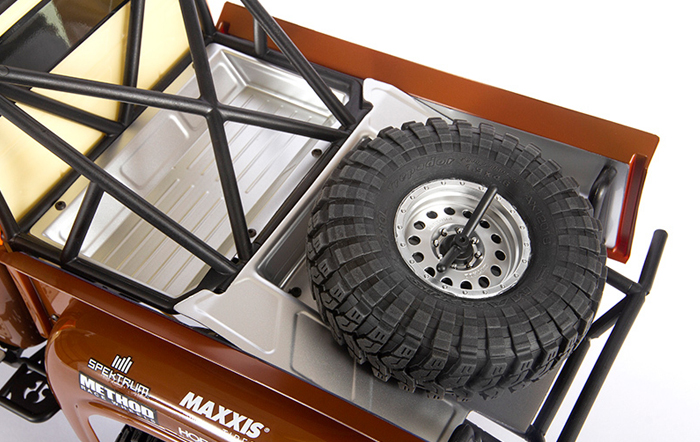 The SCX10⢠II Ford F-100 delivers class-leading performance in a convenient, ready-to-run package. Only batteries and a charger are required. Authentic body details include a front grille with chrome-coated plastic radiator and front-mounted driving lights with LEDs installed. Mounting positions are built-in to add optional LEDs for headlights and turn signal markers. Officially licensed METHOD Hole wheels and Maxxis Trepador tires - plus a working spare - take the realism down to the road.