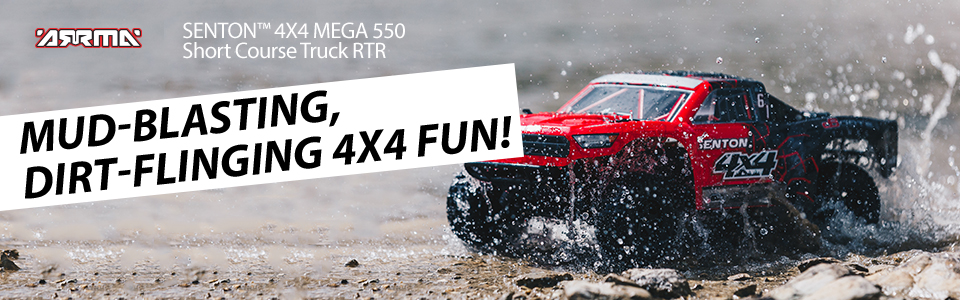 Powered by the MEGA 550 brushed motor system, the ARRMAŽ SENTON⢠4X4 MEGA RTR Short Course Truck is DESIGNED FAST, DESIGNED TOUGH - built for exciting bashing speeds and extreme, all-terrain durability! Its full-time 4WD transmission with front and rear differentials uses strong front, rear, and centerline telescoping driveshafts that can't be lost during heavy impacts, unlike dogbones. A simple, dependable, responsive steering assembly complements the ultra-reliable drive system and features a servo horn with built-in servo saver.