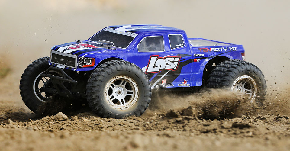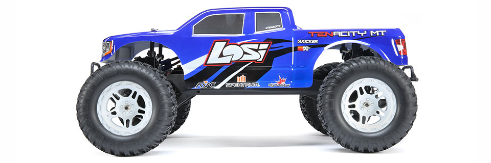 The legendary TEN platform is now more accessible and affordable than ever-with easy-to-use features and the precise control of a Spektrum⢠AVCŽ system. The 1/10 scale LosiŽ TENACITY⢠Monster Truck RTR can reach speeds of 50+ MPH on 3S power. It's tough, fast and built to last whether you're bashing on the pavement or tearing across the terrain, wet or dry. You can even measure your speed with the optional speedometer that plugs into the included radio system. Choose the TENACITY for high power, high-speed fun.