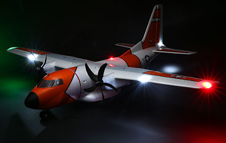 The twin power systems feature brushless outrunner motors, robust ESCs, and custom five-blade counter-rotating propellers. This setup delivers excellent performance with a 3S 3200â6400mAh LiPo battery, or you can install a 4S battery for the power to hover and unlimited vertical capability - without modifications or upgrades! There are eight factory-installed servos, including one to operate the functional cargo door so you can carry and drop creative payloads from the large cargo bay. Realistic looking LED landing, navigation and simulated strobe lights are powered from the flight battery so you can fly from dawn until dusk - from paved, grass, or dirt surfaces; off snow using the included skis; or from large ponds or lakes using optional floats (sold separately).