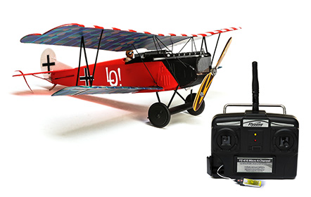 The FlyZoneÂŽ Fokker D.VII is a scale ultra-micro WWI model that's fully factory-assembled and includes everything you need to fly right in the box. Engineered to be lightweight, its overall construction makes it possible to replicate intricate scale features, and deliver flight performance that's ideal for enjoying small spaces like a gymnasium or large backyard. It excels at slow speed flight by offering docile characteristics and impressive maneuverability with simple three-channel control. In wide-open spaces, barrel rolls and loops are well within its capability. The electric power system recreates performance that's better than scale with amazing efficiency for a tiny LiPo battery so light that it holds in place with magnetic contacts. The charger for the battery is built into the included transmitter that broadcasts on glitch-free 2.4GHz radio technology.