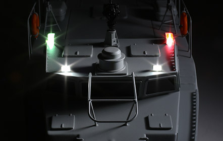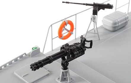 Patrol the coast with the Pro BoatÂŽ 22-inch Riverine Patrol Boat. Modeled after the US Navy's RCB (River Command Boat), this scale model has everything to make true military enthusiasts smile including molded detailed accessories such as machine guns, round life preservers, lights pods, GPS module, antennas, flag, and working LEDs. Featuring dual brushed 390 motors, 60-amp brushed LiPo compatible waterproof ESC and a durable ABS hull, you can hit the waterways with confidence. Additionally, powerful, steerable jet pumps provide full power while maintaining scale speed and steering. Plus, there are no exposed propellers so the Riverine can be used in a river or stream with as little as three inches of water. The Riverine Patrol Boat commands attention on the water or in the display case.