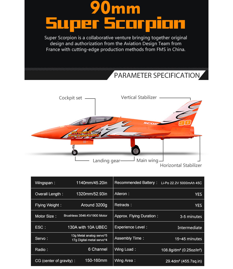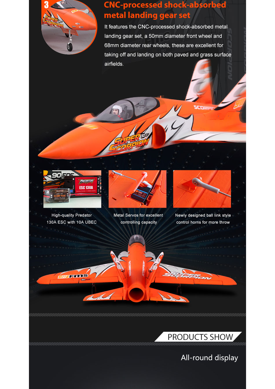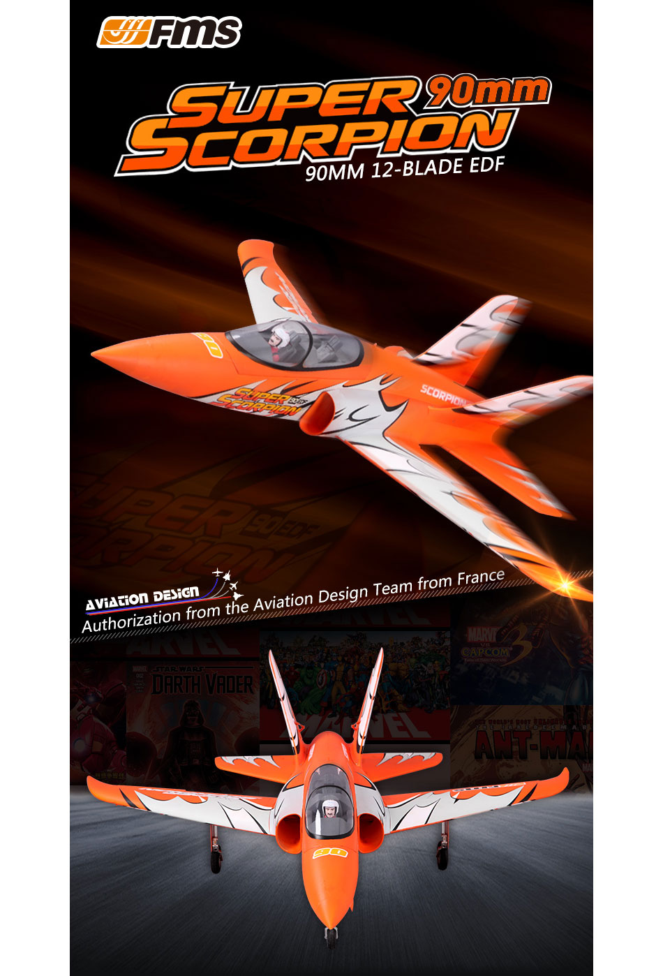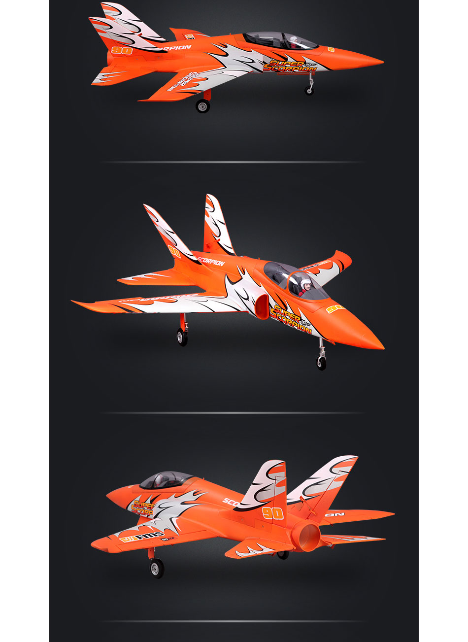 The exciting FMS 90mm Super Scorpion takes inspiration from our popular 70mm version to bring you a larger jet with all the benefits "going bigger" can provide. The result is a feature rich rocket ship that's easy to handle whether you just want to cruise around or shoot through the sky like a speeding bullet. Functional flaps increase your flight envelope even further. Wide-track landing gear offers stable ground handling and is enhanced with the incorporation of all-metal, electric retracts that include shock-absorption and large wheels for smooth operation from paved or grass airfields. All eight control surfaces are individually linked with a dedicated metal-gear micro servo. Plus, you'll enjoy the precision and adjustability of ball-link equipped linkages.