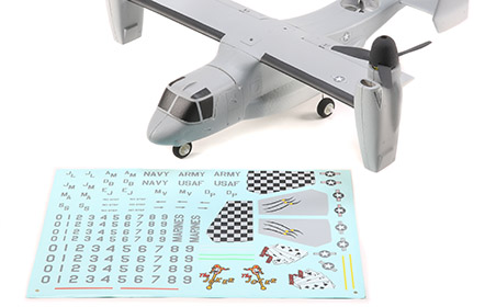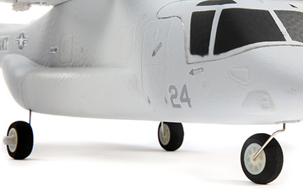Best of all you can have the V-22 in the air in almost no time at all! The airframe arrives fully-assembled with a factory-installed flight controller, servos, motors and ESCs (plus a Spektrum⢠serial receiver in the BNF Basic version). It's also factory-finished in multicolor paint, and the included decal sheet allows you to customize the finish with multiple military branch trim scheme options. The super-simple transmitter setup only requires assigning one switch for flight mode selection, then you're ready to install a fully charged 3S 11.1V 800mAh LiPo battery (sold separately) to fly. You also have the choice to install the landing gear with a castering nose wheel so you can taxi and perform 'rolling' take offs and landings, or you can leave it off to enjoy the 'retracted' gear look.
